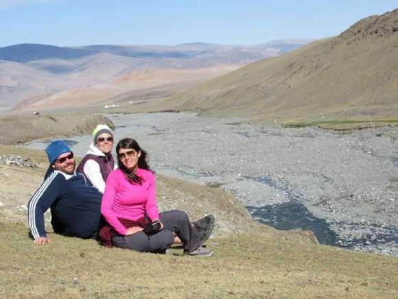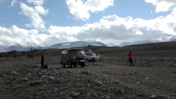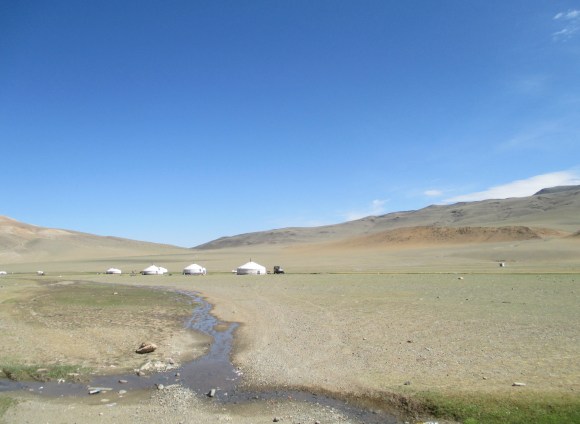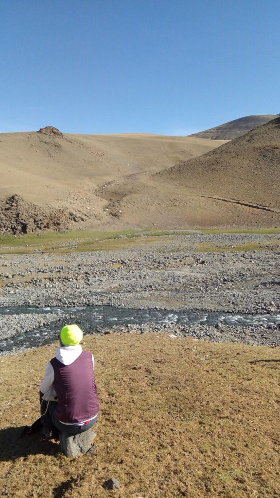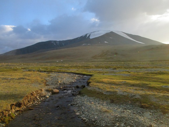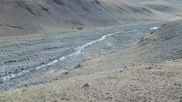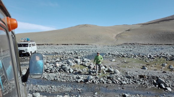 Siamo ormai nel cuore del parco nazionale mongolo Altai Tavan Bogd e corriamo paralleli al confine con la Cina. Complice anche la luce che è cambiata rispetto alla mattinata uggiosa, il paesaggio è davvero spettacolare con i suoi colori che adesso vanno dal giallo della terra al blu del cielo e dei fiumi passando per il verde acceso della vegetazione e il bianco dei ghiacciai che ci circondano. Qualcuno del gruppo si cimenta in una sfida di attraversamento di un fiume saltellando da una pietra all’altra con risultati a dir poco rovinosi che purtroppo non sono stati documentati in un video o in una foto.
