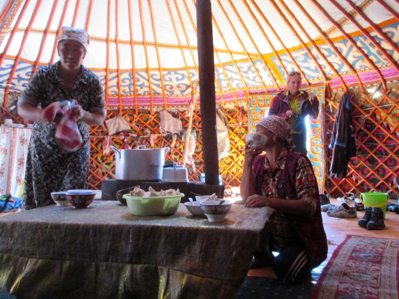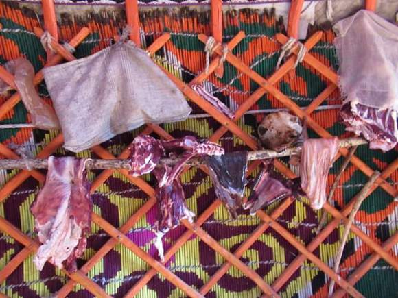 La ger kazaka è più alta e riccamente decorata di quella mongola, una vera e propria esplosione di colori e arazzi appesi alle pareti insieme a pezzettoni di carne lasciata a “frollare naturalmente” (quest’ultima solo per stomaci forti).