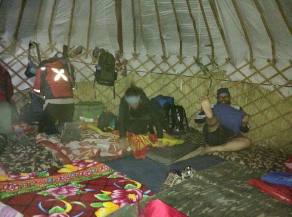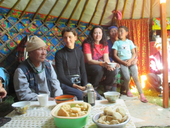 Possiamo solo intuire nell’oscurità totale il paesaggio attorno, intanto facciamo conoscenza con le cuoche e i “montatori” che viaggeranno insieme a noi per tutta la settimana. Ammassiamo gli zaini all’interno della nostra ger dove sono già state apparecchiate due tavolate per la cena. Costante presenza nel menu dei prossimi giorni saranno, indistintamente che si tratti di colazione pranzo o cena, biscotti locali tipo wafer rigorosamente scaduti, una crema spalmabile bigusto cioccolata-nocciola, burro e il mitico thè AKBAR.