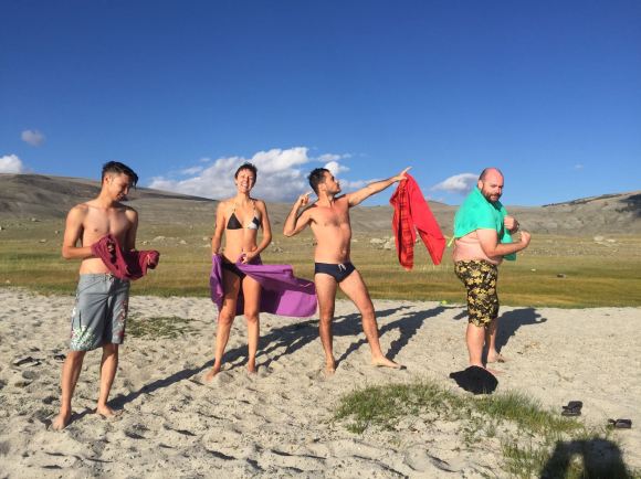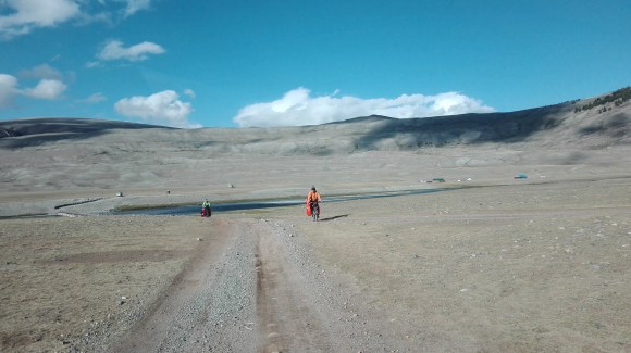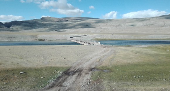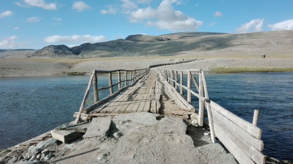 Dobbiamo solamente attraversare un ponte di legno a prima vista pericolante sul fiume Khovd Gol prima di raggiungere uno delle mete più suggestive del viaggio ovvero il Khoton Lake dove ci accamperemo per due notti. Prima di farlo incontriamo due coraggiosi russi che stanno attraversando il paese in bici. Eroi. A loro va il nostro più grande in bocca al lupo ma noi teniamo le chiappe strette durante la traversata.