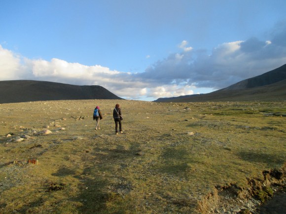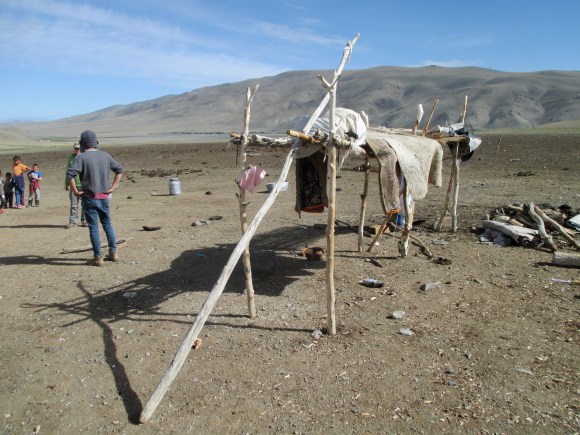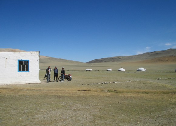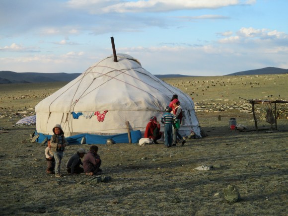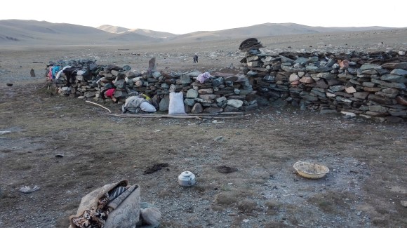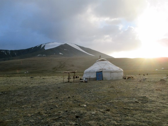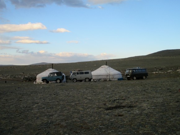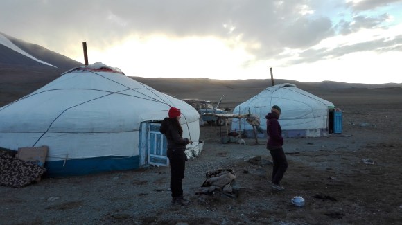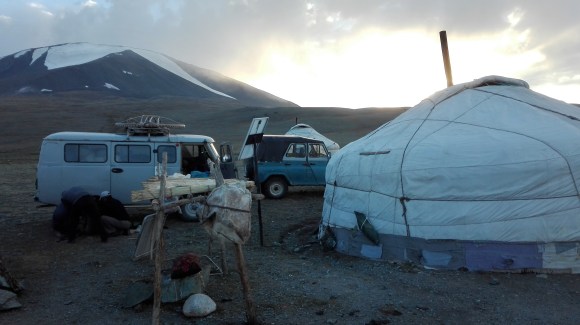 Proprio quando pensi che di paesaggi splendidi nello stesso giorno ne hai visti abbastanza le UAZ fanno capolino in un’ampia vallata sormontata da un ghiacciaio dietro al quale il sole sta tramontando. Eh ma dai, avevo appena messo via la macchina fotografica… E’ un luogo da lagrime ai occi. Qui abita una famiglia nomade presso la quale trascorreremo la notte. Ci offrono addirittura di dormire insieme a loro nella ger principale poichè prossimi all’oscurità, ma la presenza di quarti di montone all’interno della tenda provoca qualche malumore all’interno del gruppo che quindi si rende disponibile ad aiutare i montatori a tirar su Kaza Nostra.