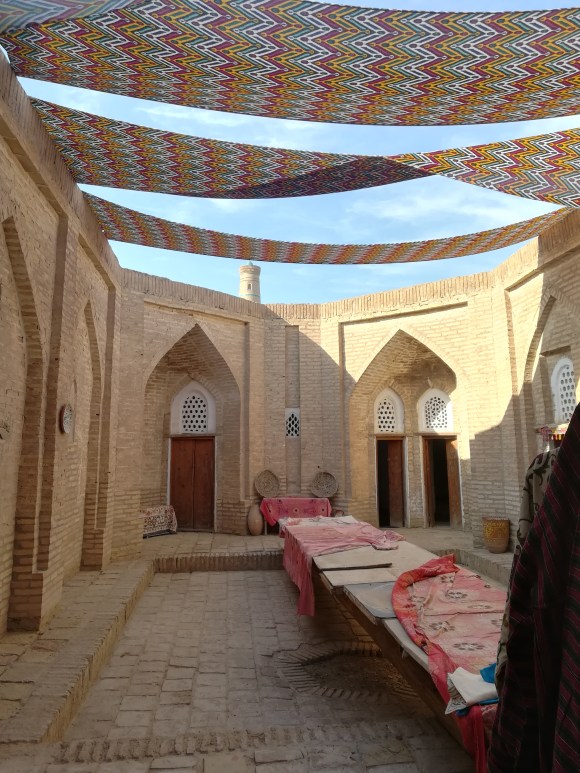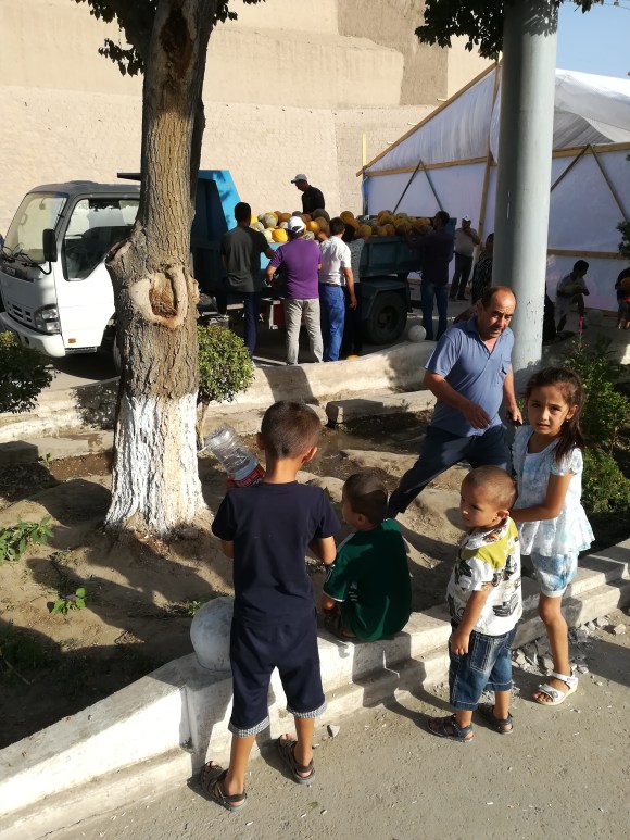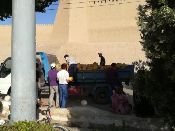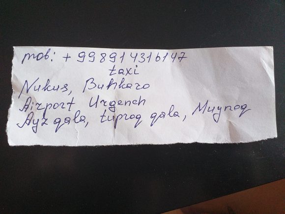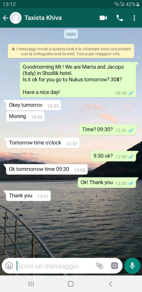 E fu così che “tomorrow time o’clock” ci facciamo trovare pronti e zainati all’uscita della nostra guesthouse. Puntualissima arriva un’auto che in effetti non è quella del nostro tassista e men che meno l’autista è il nostro tassista che -a gesti- ci fa capire che è un collega del nostro contatto e che sarà felice di accompagnarci a Nukus. Salutiamo una Khiva in fermento per la festa dell’anguria e procediamo confortevoli verso nord-ovest.