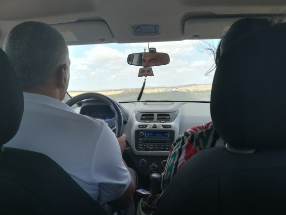 E fu così che “tomorrow time o’clock” ci facciamo trovare pronti e zainati all’uscita della nostra guesthouse. Puntualissima arriva un’auto che in effetti non è quella del nostro tassista e men che meno l’autista è il nostro tassista che -a gesti- ci fa capire che è un collega del nostro contatto e che sarà felice di accompagnarci a Nukus. Salutiamo una Khiva in fermento per la festa dell’anguria e procediamo confortevoli verso nord-ovest.