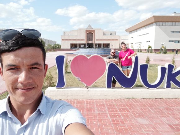 Camminiamo per le vie poco trafficate di Nukus fino al museo della Collezione Savitsky composto da due grandi edifici nel bel mezzo di una piazzetta dove una coppia di sposi con relativi parenti al seguito si lascia immortalare da una troupe di fotografi e videomakers; c’è anche un addetto a portare una gabbia di colombe bianche che vengono liberate a favore di scatto fotografico.