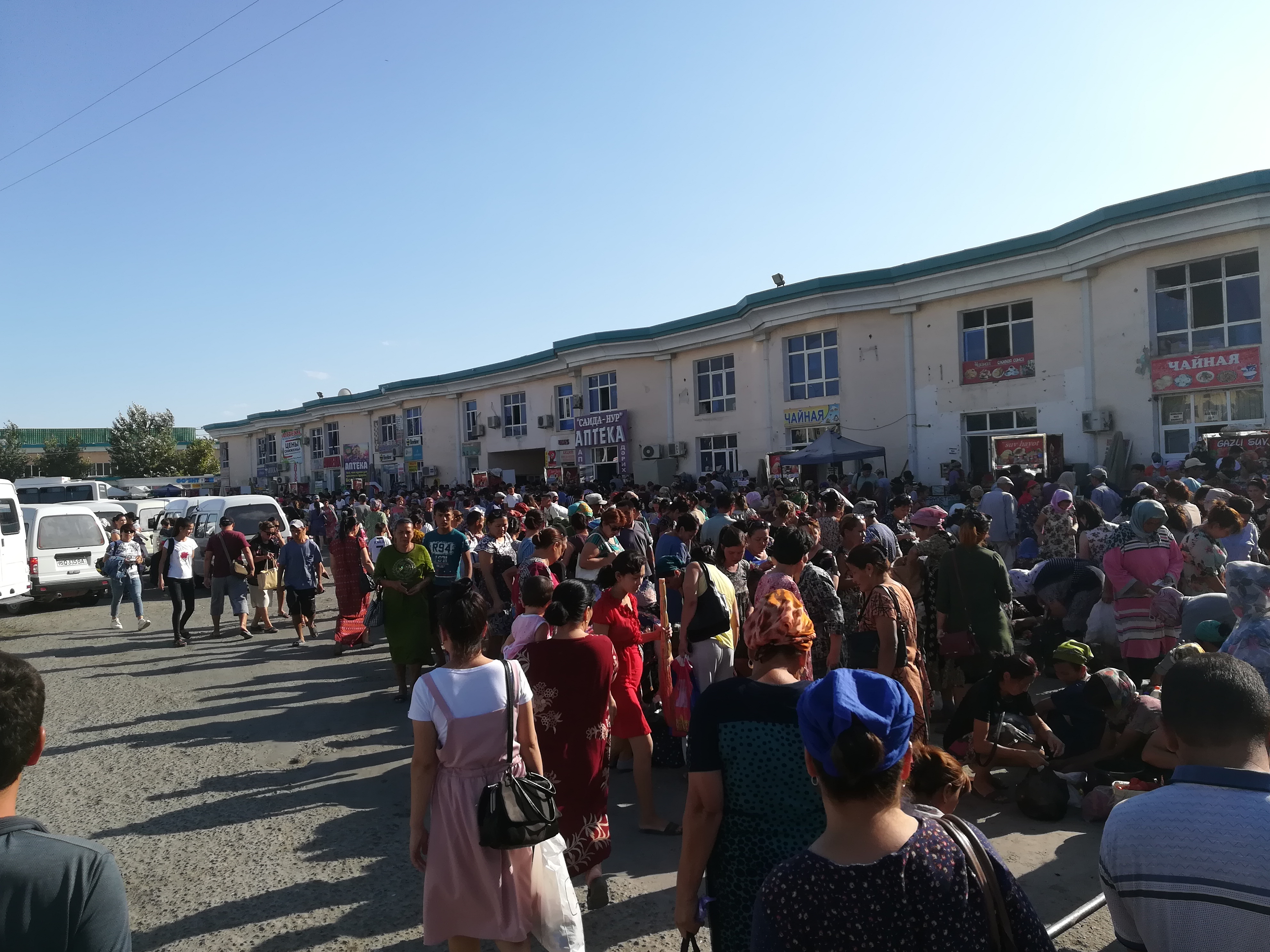Dal museo raggiungiamo il mercato di Nukus e di colpo ci troviamo schiacciati tra centinaia di persone che si muovono tra banchetti colorati da tutti i tipi di frutta secca, formaggi, teste di pecore, biglietti della lotteria, biscotti, utensili artigianali, macellerie all’aperto, distributori di latte, una distesa a perdita d’occhio di uomini e merci. Ah ecco dove erano finiti tutti! Troviamo uno scalino dove sedere e osservare la frenesia del mercato. Nel frattempo sgranocchiamo dei biscotti buonissimi comprati a peso.