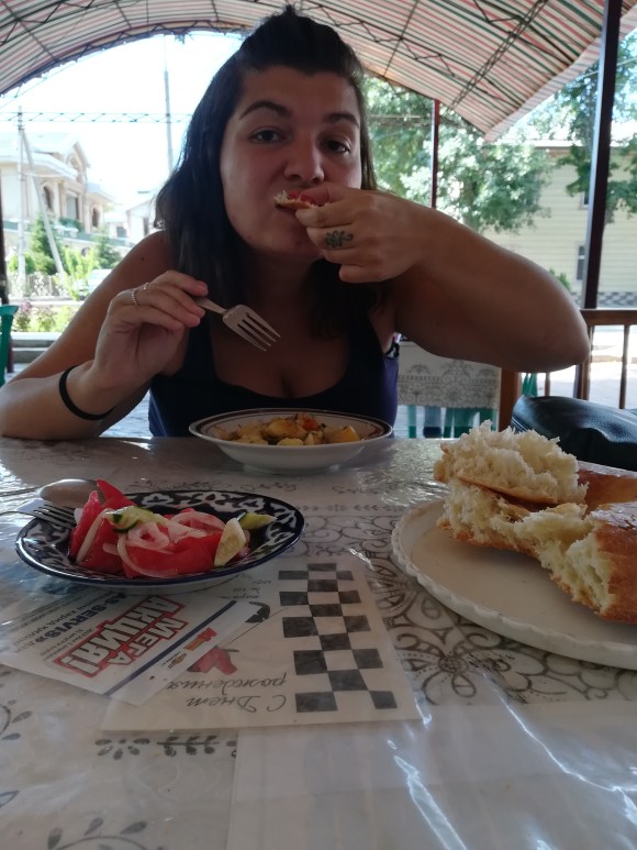 Marta ormai ristabilita apprezza un piatto di patate e verdure cotto a vapore. Tazabay rispetta ma fa fatica a comprendere la sua scelta di essere vegetariana. “Why? Il montone, le pecore, le mucche sono fatte per essere mangiate”. Si spiegano i propri punti di vista. Io mi bevo il black tea e mangio anche un pezzo di obi, il pane tipico fatto in casa che sicuramente “sùga su“.